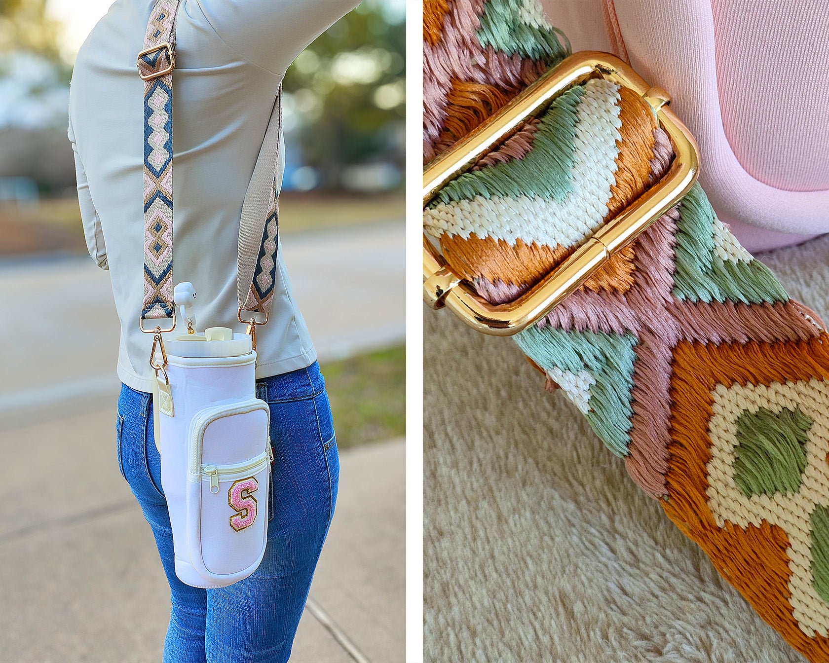 Meet our awesome Handcrafted Tumbler Pouch! The perfect accessory to add a touch of personality to your on-the-go style! Whether you're looking for a cute way to accessorize your tumbler or need a hands-free solution for your essentials, our personalized tumbler bag has you covered.