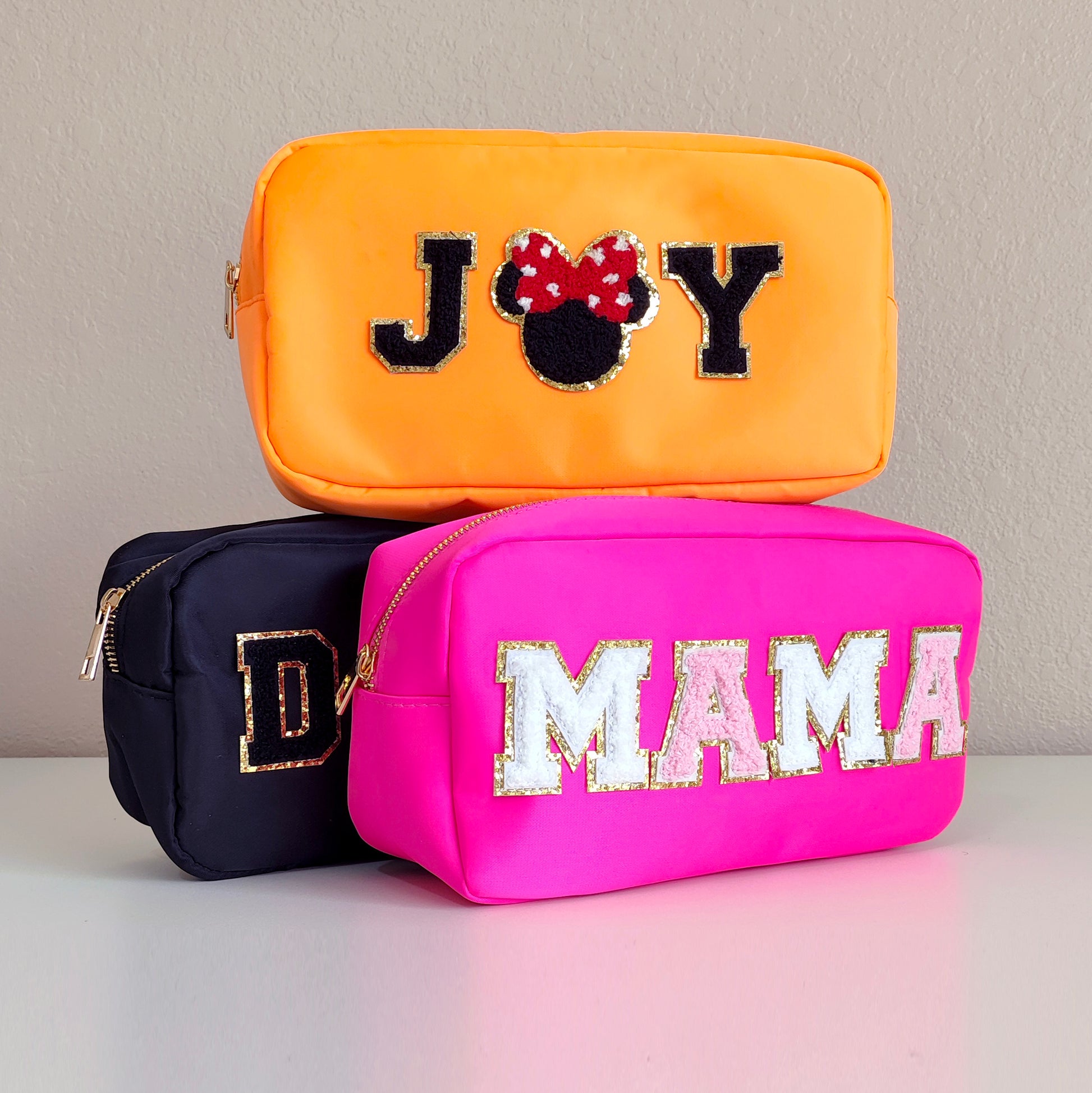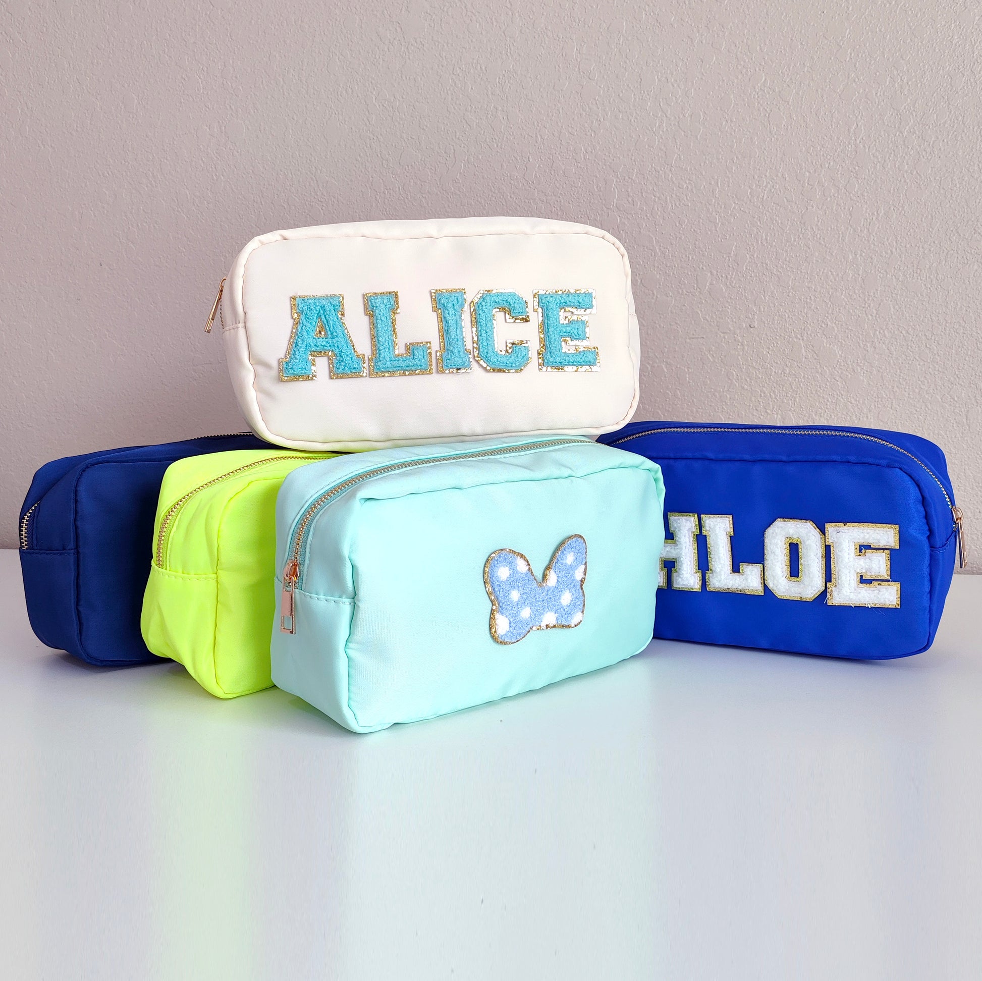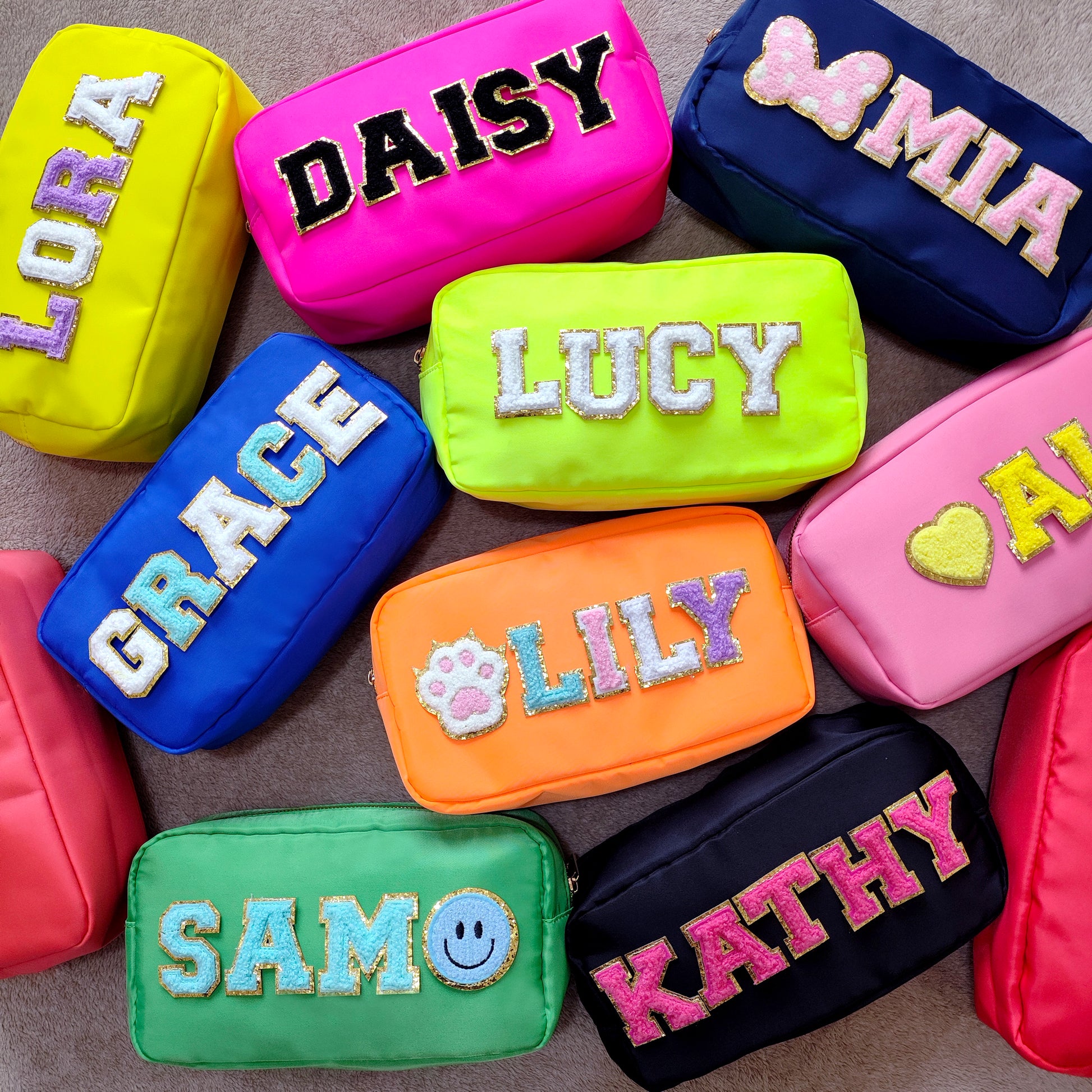 Meet our personalized nylon makeup bag with hand-stitched letter patches! Ideal for travel, snacks, and makeup storage, this bag combines practicality with a personalized touch. Choose your letter colors for a unique and thoughtful gift. With a spacious interior, perfect for organizing makeup accessories, and an extra-large capacity for all your beauty essentials. Compact and convenient for on-the-go style.